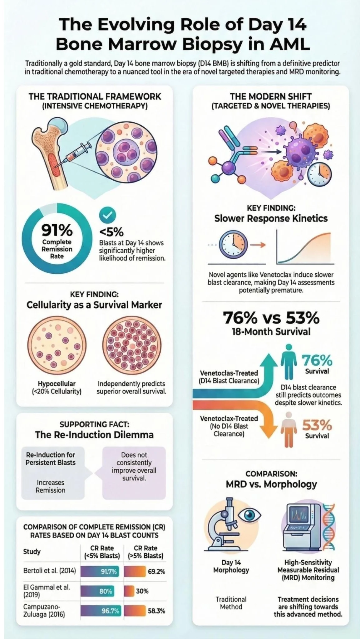 For years, the Day 14 bone marrow biopsy (D14 BMB) has guided AML treatment decisions, where less than five percent blasts strongly predicted complete remission following standard seven plus three induction.