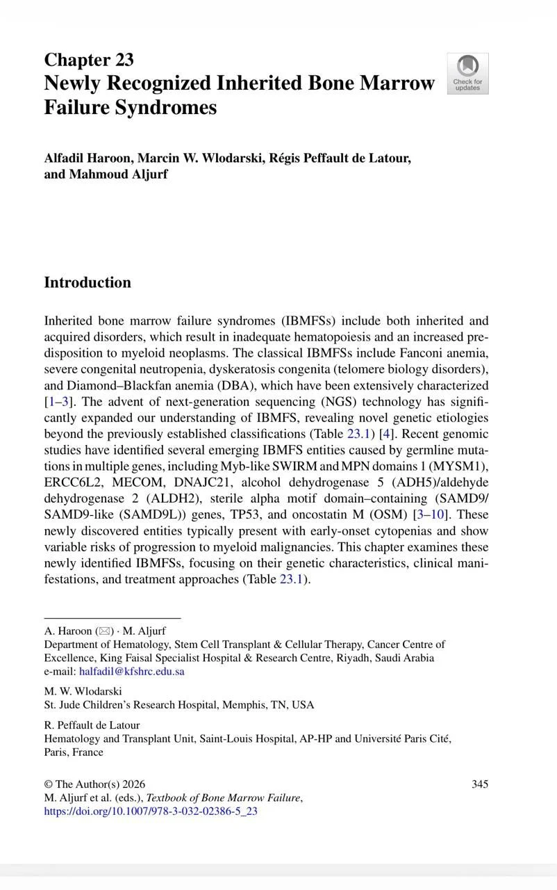 “Happy to share our book chapter titled ‘Newly Recognized Marrow Failure Syndromes‘ in the textbook on bone marrow failure syndromes.