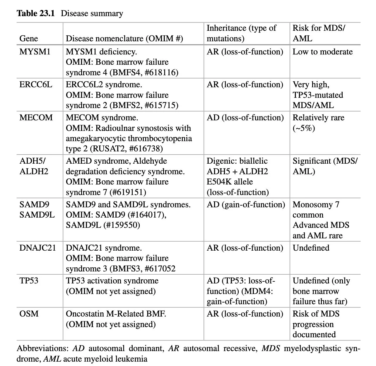 Advances in Next-Generation Sequencing have enabled the discovery of several novel genetic etiologies, including MYSM1, DNAJC21, ADH5/ALDH2, MECOM, ERCC6L2,TP53,OSM, and SAMD9/SAMD9L.