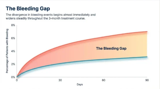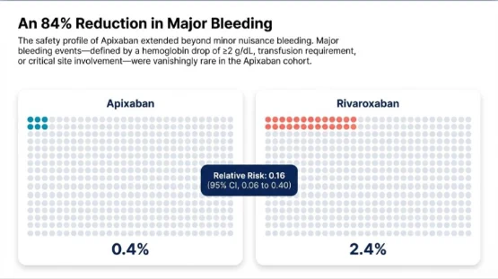 • Superior Safety: Apixaban cut the risk of clinically relevant bleeding by more than half and drove an 84 percent reduction in major bleeding.