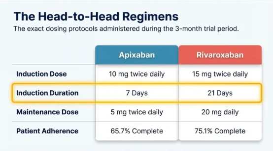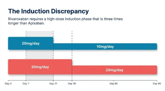 Rivaroxaban requires a high-dose induction phase that is three times longer than apixaban (twenty-one days versus seven days).