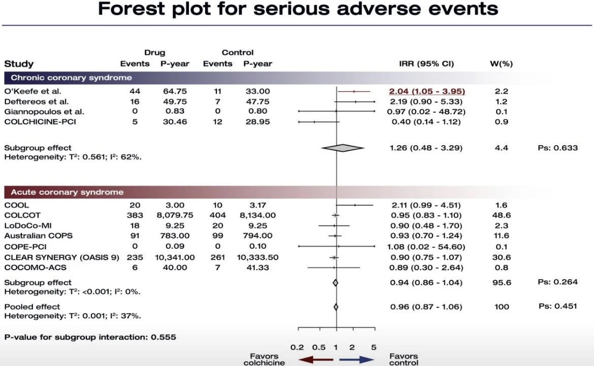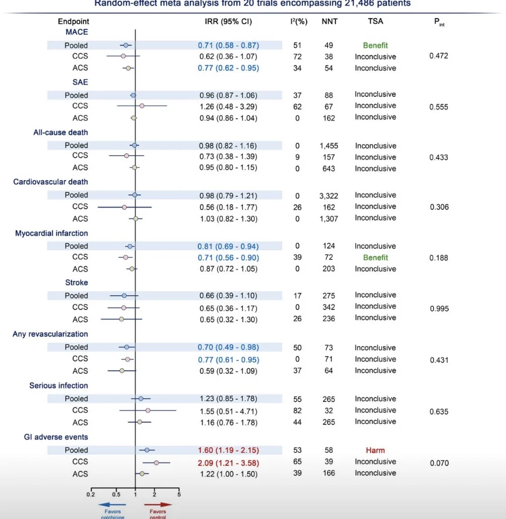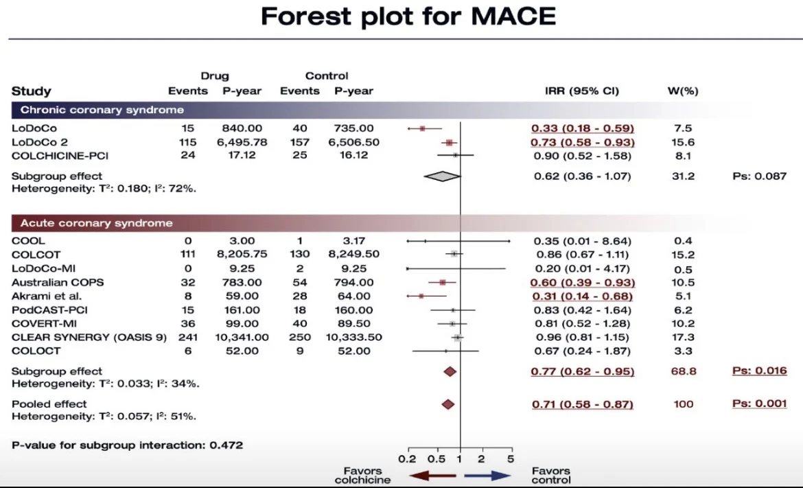 Overall, colchicine reduced MACE by 29%, driven by a 19% reduction in myocardial infarction and 30% reduction in revascularization, without inreasing serious adverse events. These resulted in a number needed to treat of 49 patients, and a NNT/NNH ratio of 0.5. Importantly, no significant interaction by presentation was detected, suggesting that both ACS and CCS patients may benefit from colchicine adminsitration.