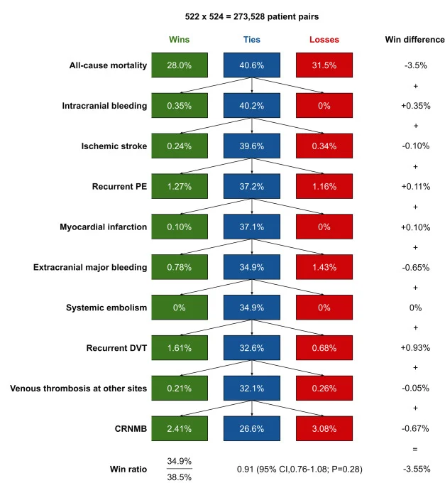 Novel win ratio analysis comparing edoxaban versus dalteparin in cancer-associated VTE reveals no significant difference between treatments when evaluating hierarchically prioritized outcomes including mortality, recurrent events, and bleeding complications.”