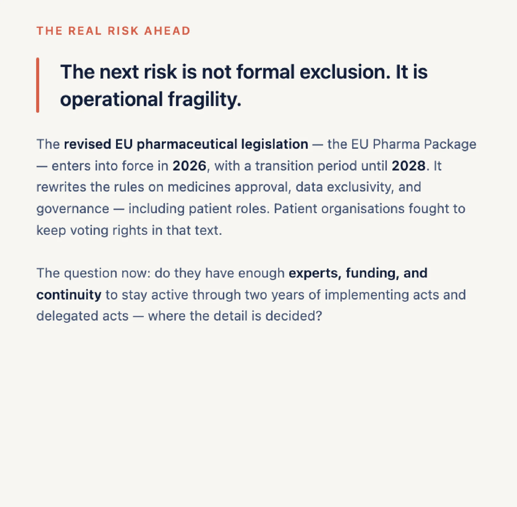 It is follow-up: capacity, continuity, support, and the ability of patient organisations to remain present where decisions are actually shaped and budget cut.