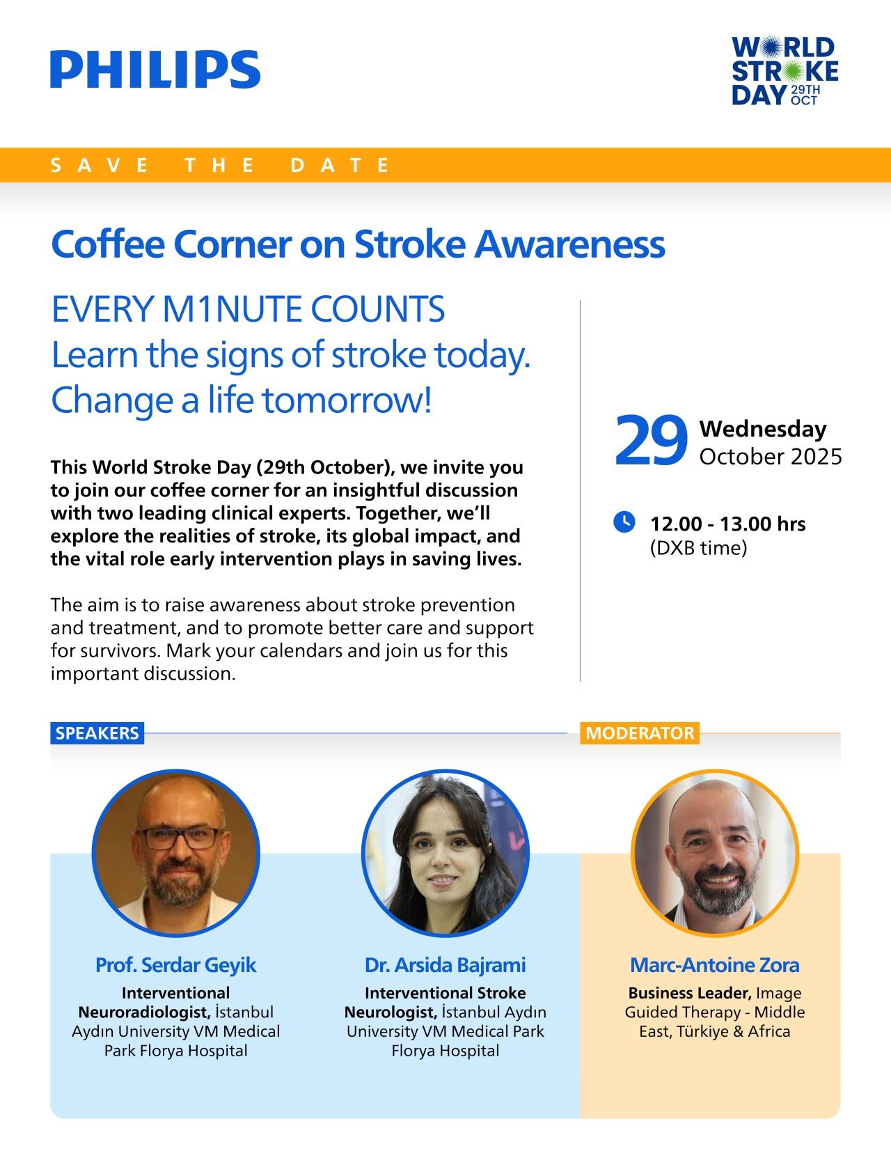 To honor the occasion, we hosted a very special Virtual Coffee Corner moderated by Marc-Antoine Zora, featuring two leading experts in the stroke domain — Prof. Serdar Geyik, Interventional Neuroradiologist, and Dr. Arsida Bajrami, Interventional Neurologist.