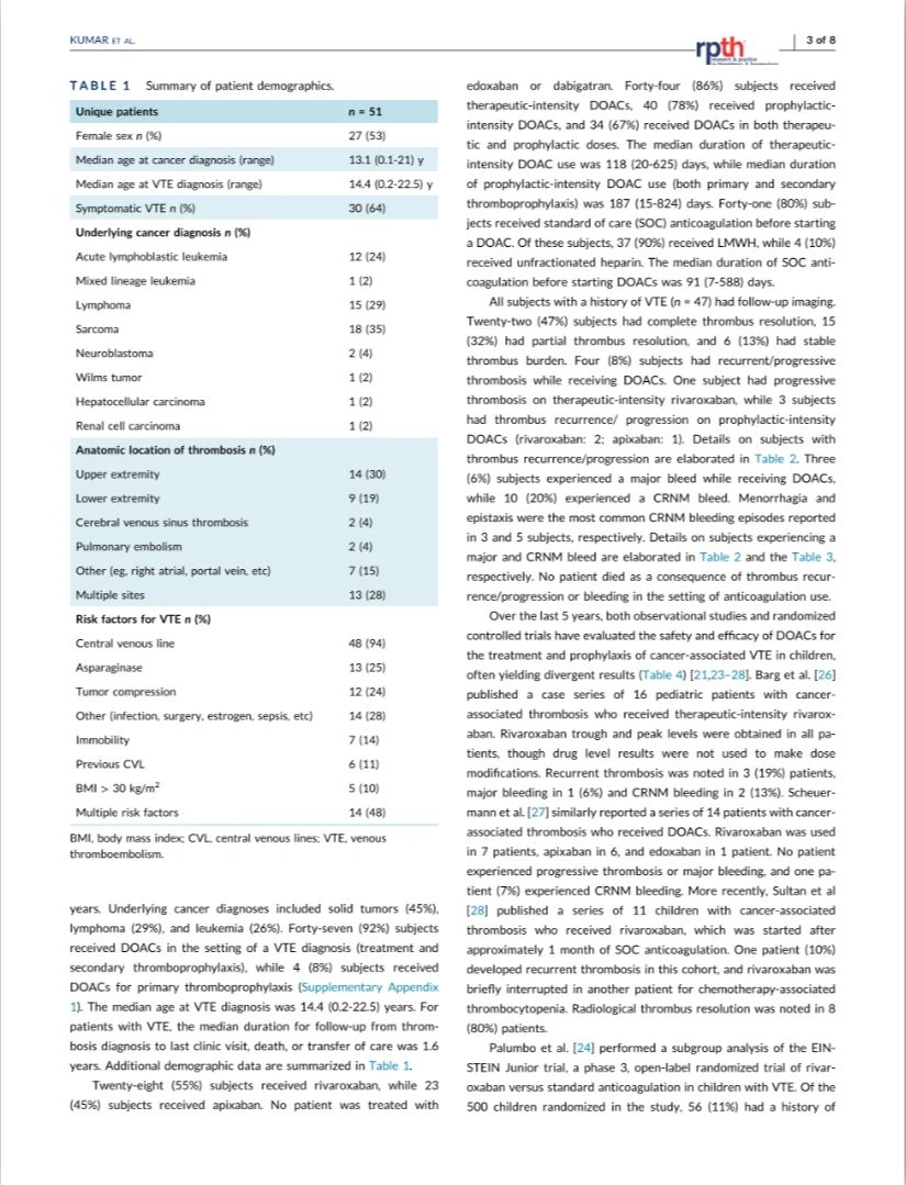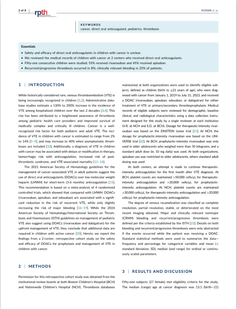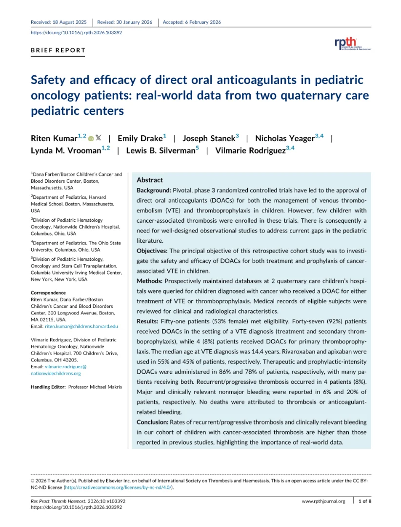 A recent publication in Research and Practice in Thrombosis and Haemostasis (RPTH) explores the safety and efficacy of direct oral anticoagulants (DOACs) in pediatric oncology patients, presenting real-world data from two tertiary pediatric centers.