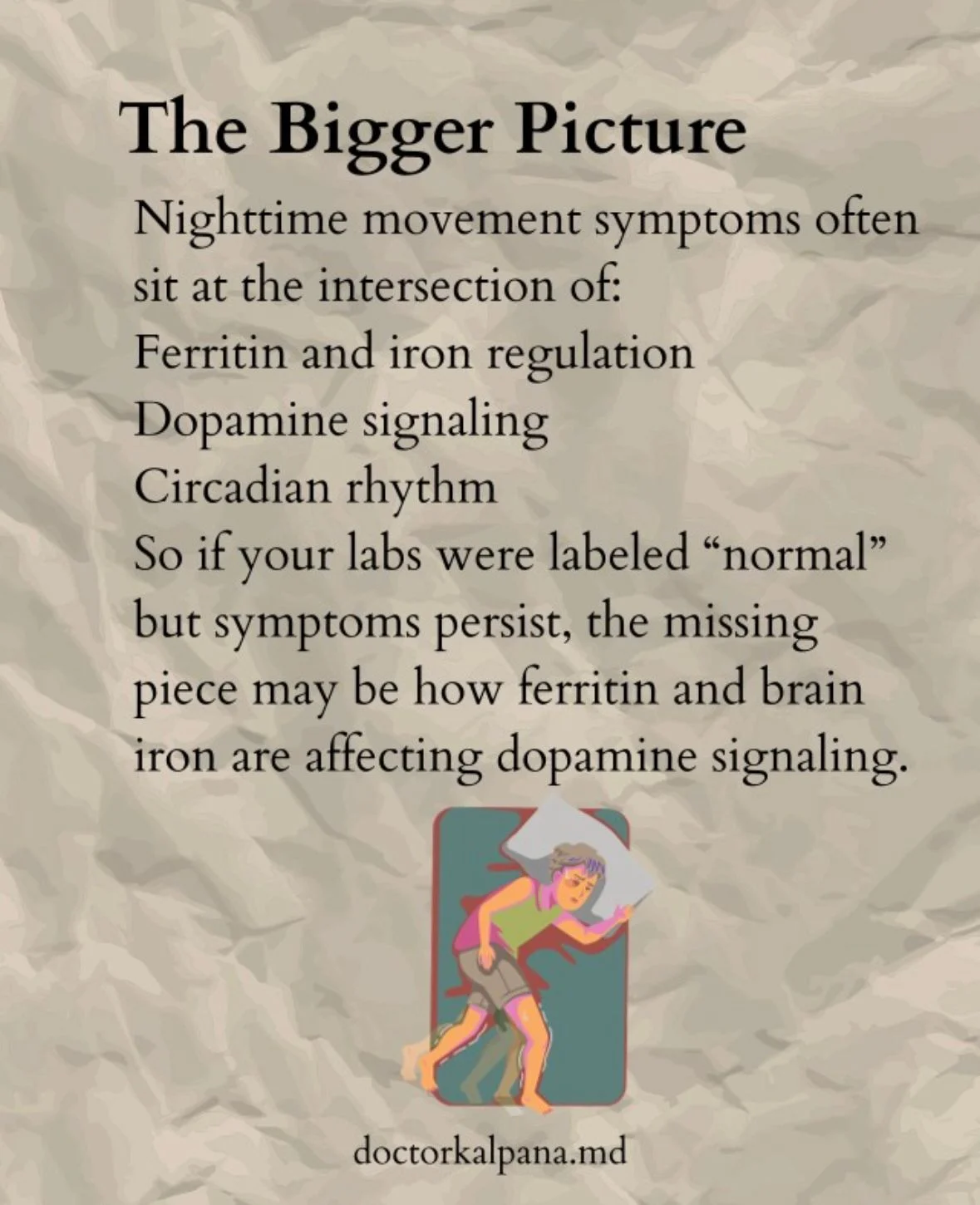 Seen together, these symptoms often lie at the intersection of ferritin levels, dopamine signaling, and sleep physiology.