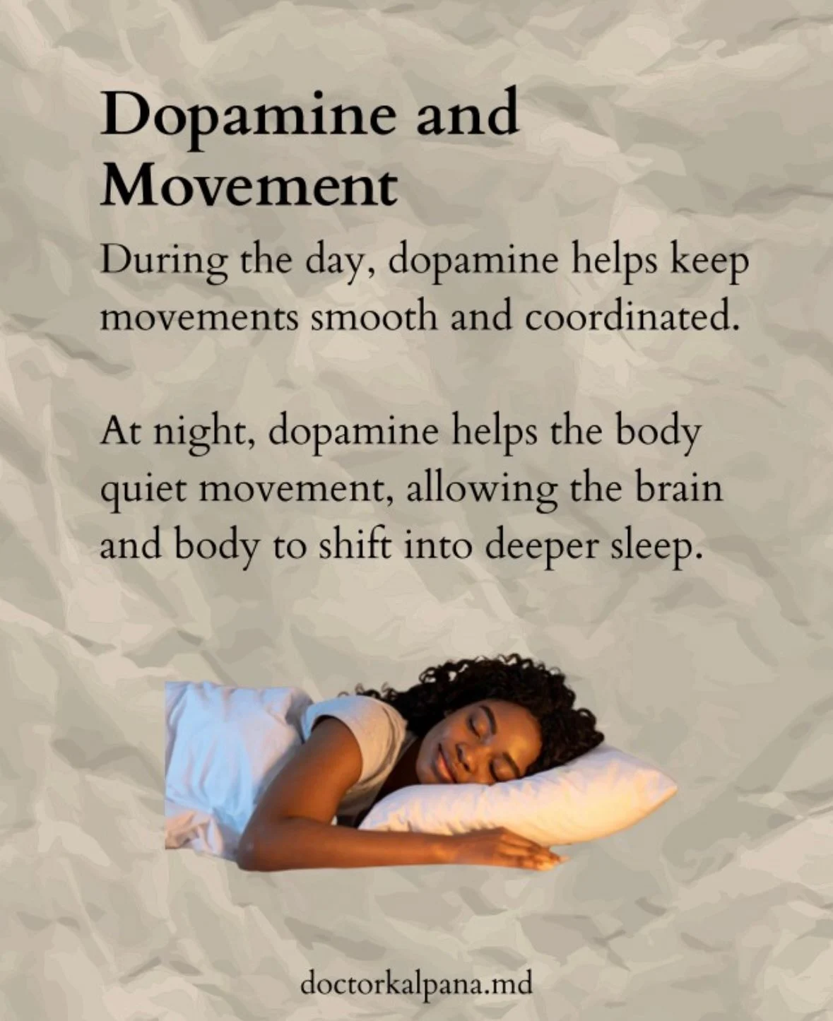 Dopamine plays a key role not only in coordination during the day but also in reducing unnecessary movement at night, allowing the body to transition into deeper stages of sleep.