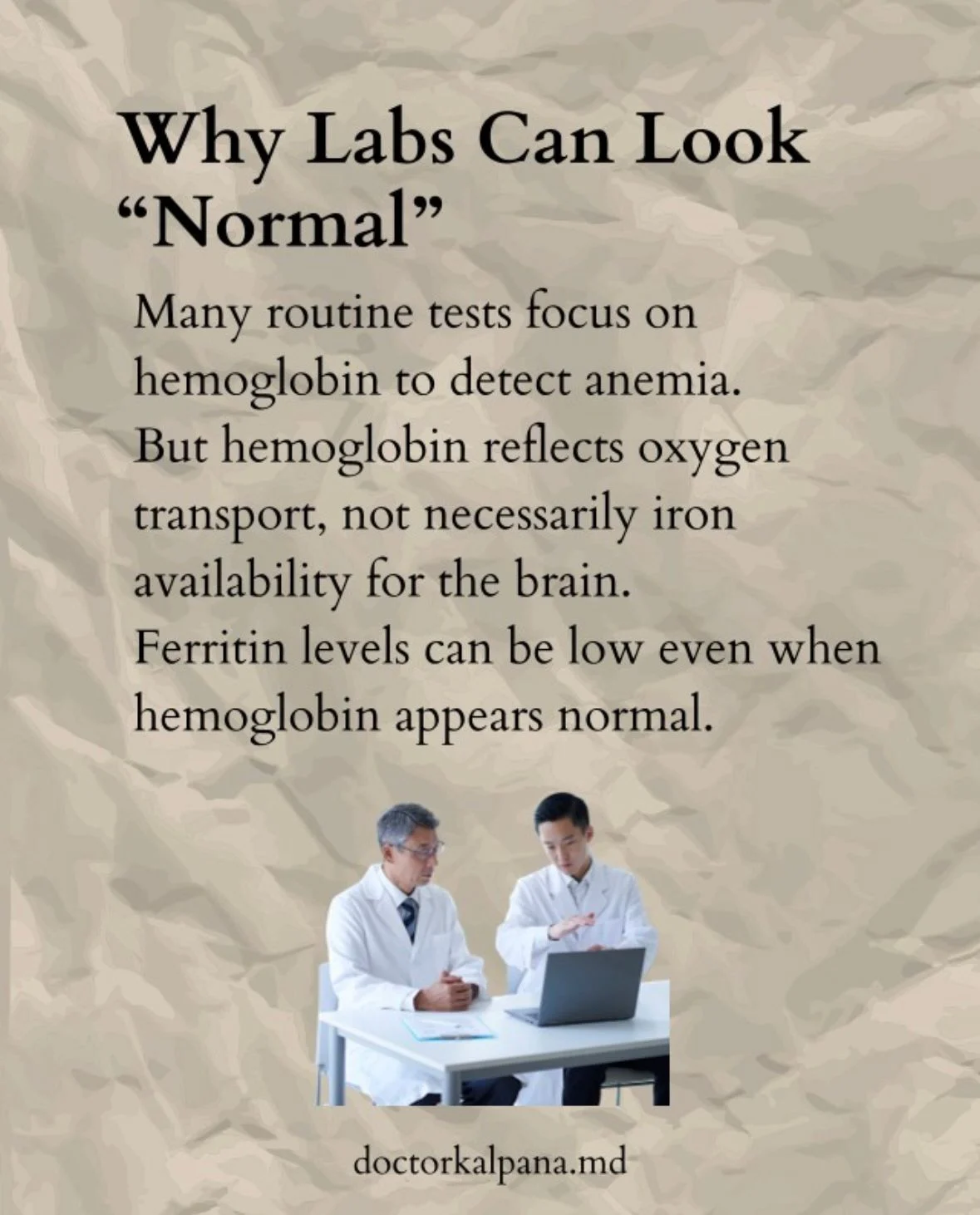 Routine testing typically focuses on hemoglobin to assess anemia, but hemoglobin primarily reflects oxygen transport in the blood. It does not necessarily reflect how much iron is available for the brain.