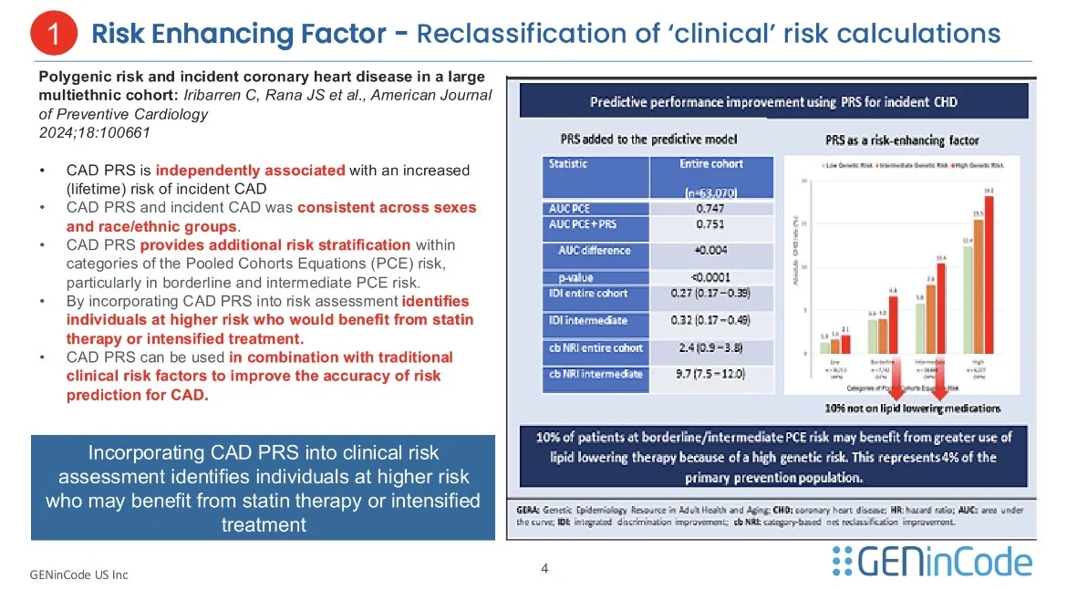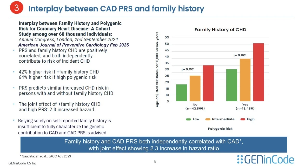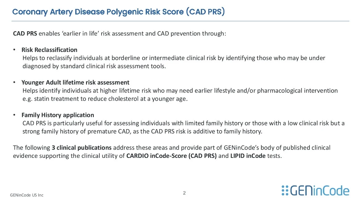 GENinCode and our partners have developed CARDIO inCode-Score (CAD PRS) and LIPID inCode tests over the past 15 years and have amassed a significant body of clinical evidence to support the utility of CAD PRS.