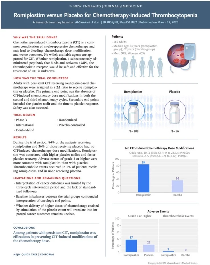 A paper in this week’s New England Journal of Medicine by Hanny Al-Samkari and colleagues reports on a double-blind study of Romiplostim vs Placebo for Chemotherapy-induced Thrombocytopenia.