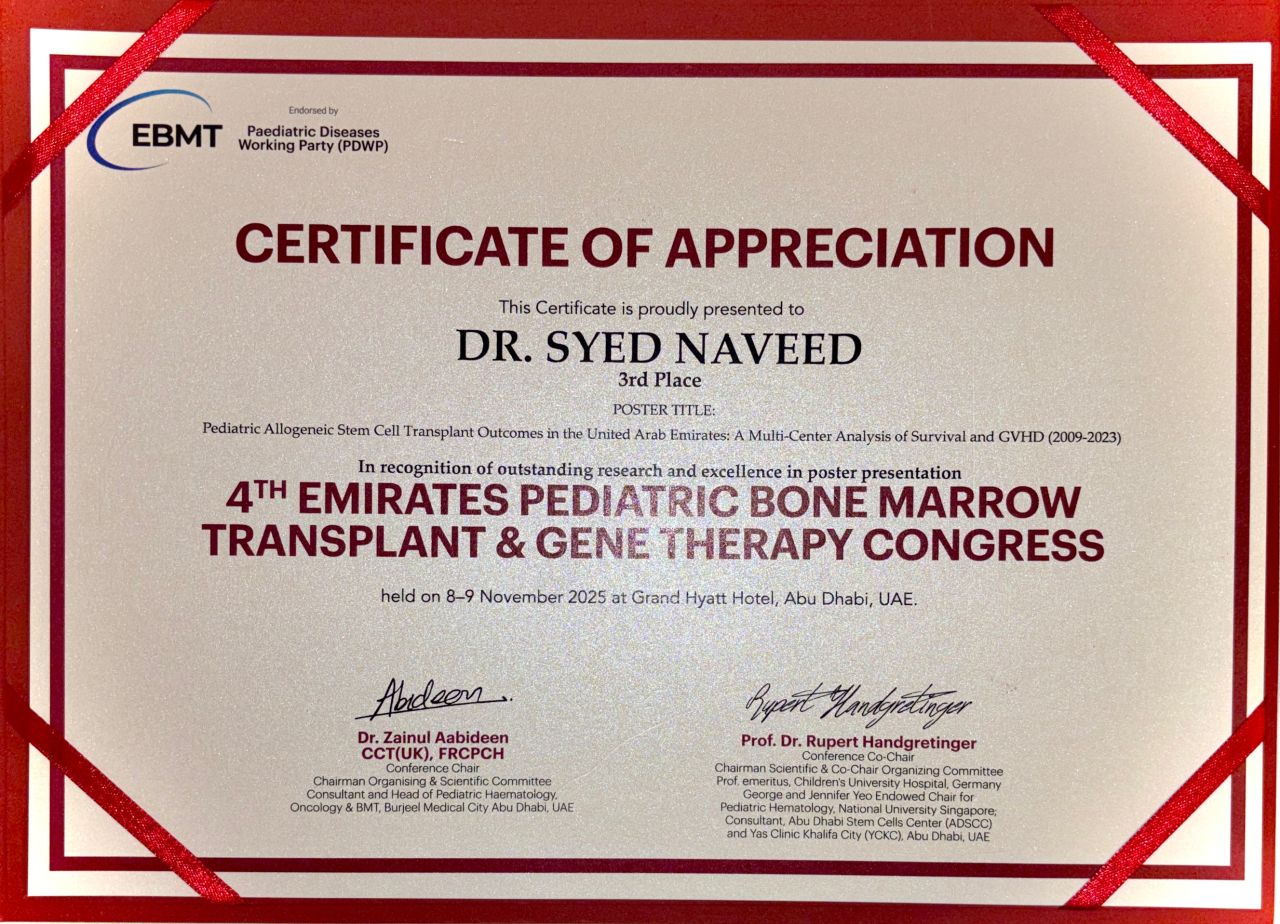 Honoured that our work received 3rd Place at the 4th Emirates Pediatric Bone Marrow Transplant and Gene Therapy Congress, endorsed by EBMT — a recognition of years of dedication by Abu Dhabi’s pediatric hematology–oncology teams.