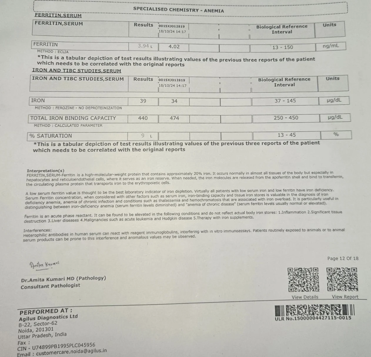 - Iron studies – consistent with iron deficiency anemia (IDA)