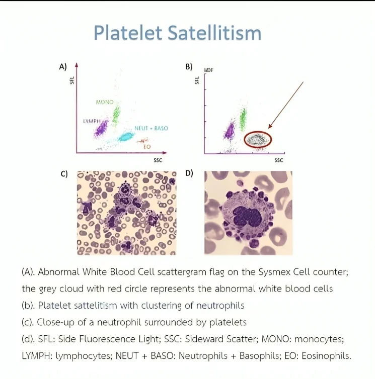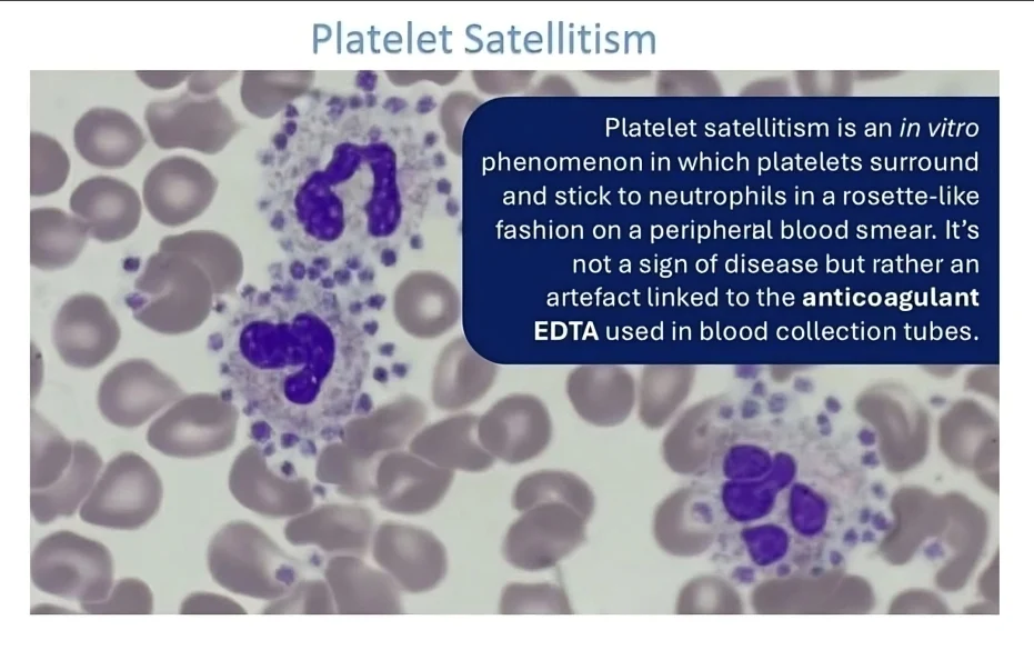 Platelet Satellitism is a phenomenon in which Platelets surround and adhere to neutrophils in blood samples collected with EDTA as an anticoagulant, leading to pseudothrombocytopenia (a falsely low platelet count).