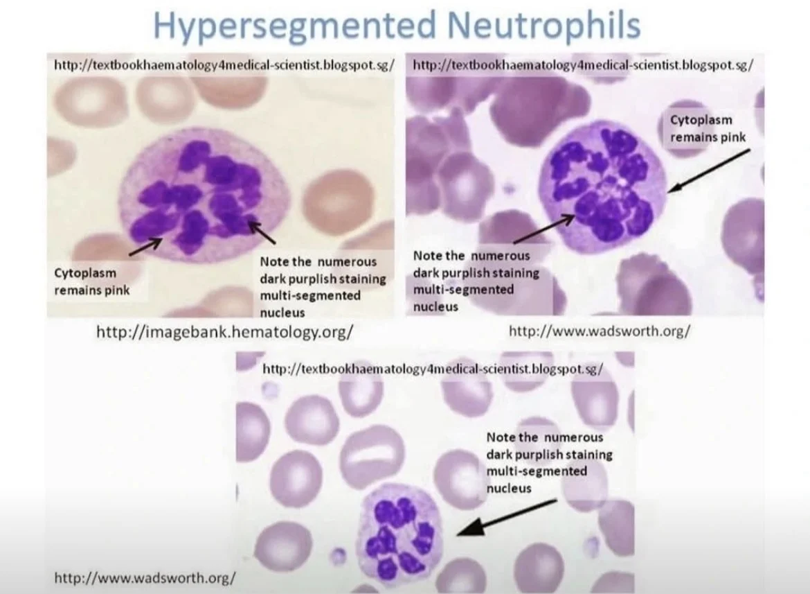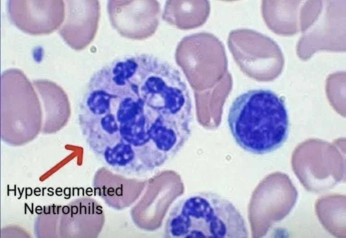 WBC: Hypersegmented Neutrophils. - Serum Cobalamin: For detection of Vitamin B12 deficiency.