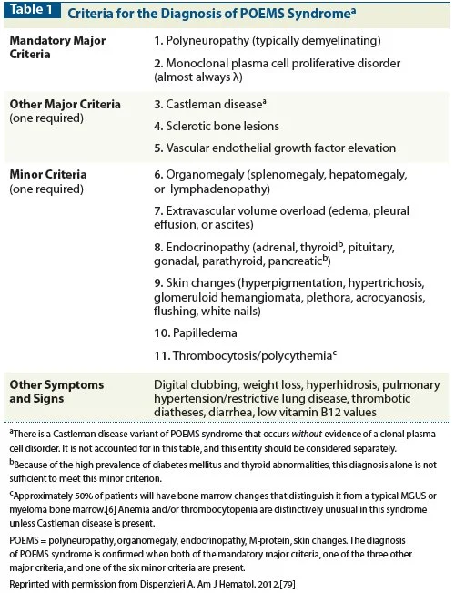 ”POEMS syndrome is a rare, severe paraneoplastic disorder caused by an underlying plasma cell disorder, characterized by polyneuropathy, organomegaly, endocrinopathy, M-protein, and skin changes.