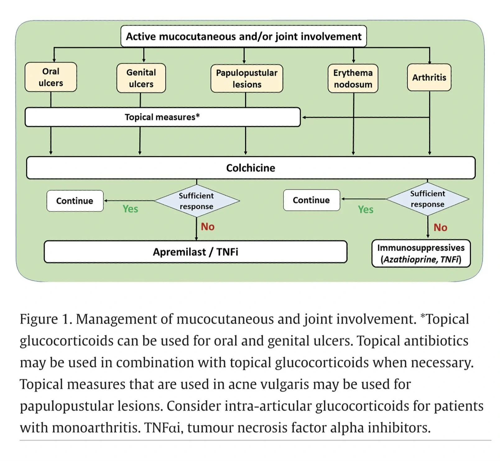 - Mucocutaneous and joint involvement: Colchicine is first-line; apremilast or TNFα inhibitors for refractory cases.