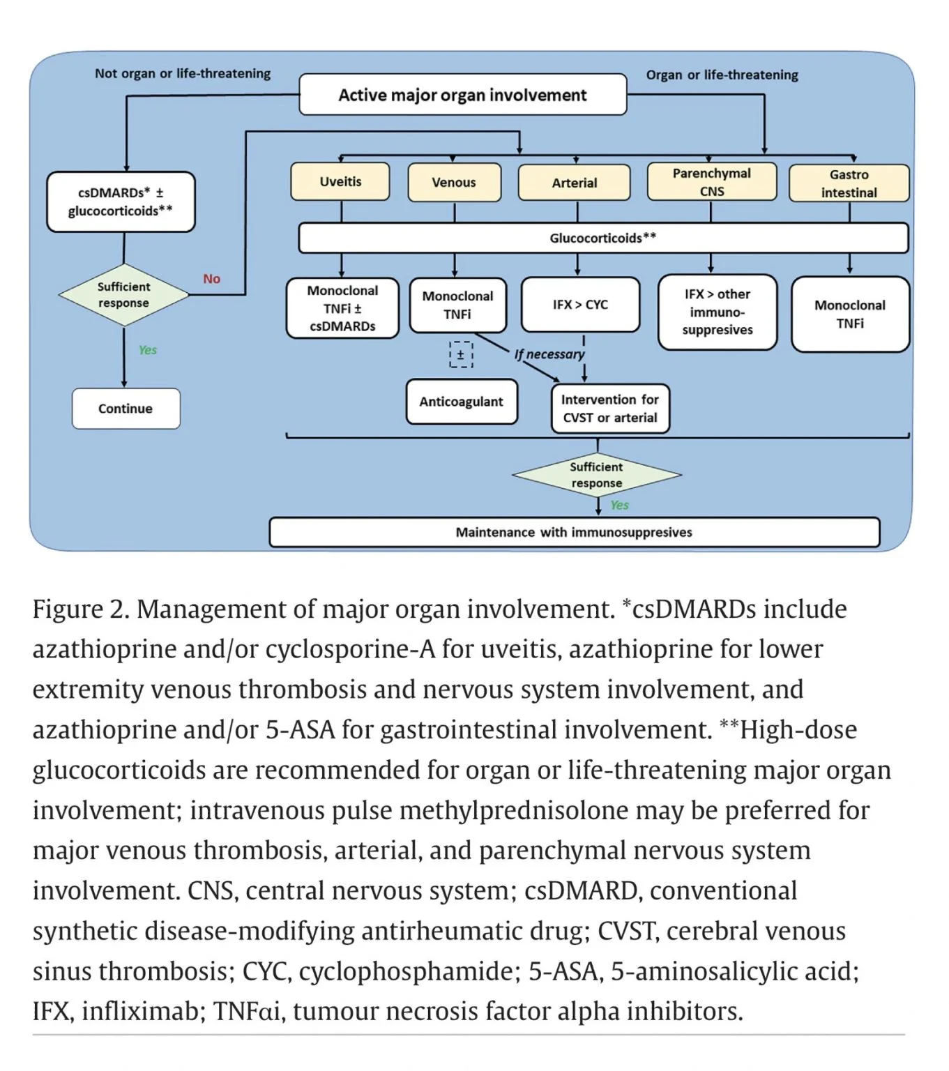 - Organ-threatening disease: Early aggressive therapy with glucocorticoids and immunosuppressives, with prompt use of monoclonal TNFα inhibitors encouraged for severe or life-threatening manifestations.